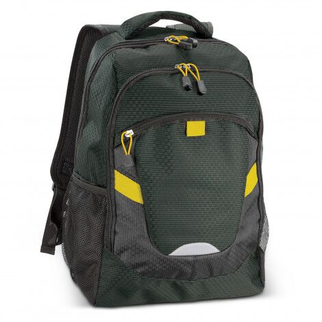 Attention-grabbing backpack with outstanding design and superb functionality. It is manufactured from a stunning two-tone combination of patterned 300D polyester with a 600D polyester back panel and 210D lining. Summit has a large zippered main compartment with a padded laptop sleeve and two smaller external compartments with zippers. It has a padded back and adjustable shoulder straps with breathable padding for extra comfort. Other features include two mesh side pockets, a padded carry handle, a hi-vis reflector on the front, smart elastic zipper pulls and trendy coloured accents.
