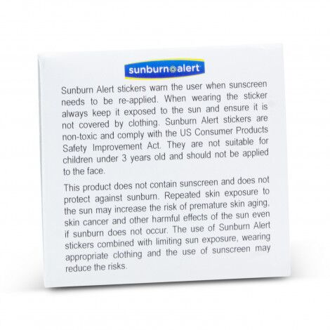 Pack of four Sunburn Alert stickers that take the guesswork away from when it is time to re-apply sunscreen. They are a practical and easy to use warning device for anyone who is out in the sun. The user places a sticker on the back of their hand and applies sunscreen over it at the same time it is being applied to other parts of the body. Each sticker is UV sensitive and turns blue when sunscreen protection diminishes and the skin is being exposed to harmful UV rays. The sticker will turn white again when sunscreen is re-applied, indicating protection has been restored. Instructions for application and use are printed on the cardboard pack and it can be branded in full colour on the front at no extra cost. This product is not suitable for children under three years old, does not contain sunscreen and does not protect the user against sunburn. A production lead time of 25 working days applies to this product by air freight.