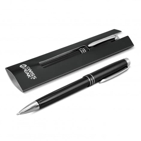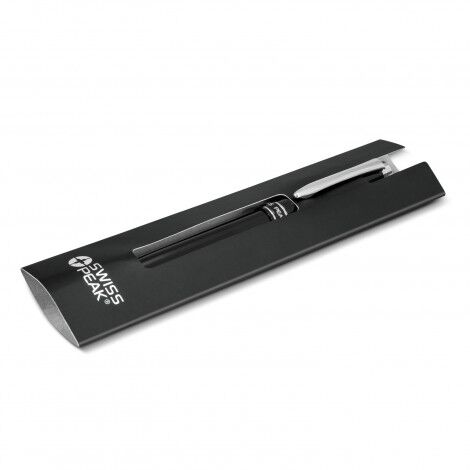 Precision Swiss Peak ballpoint pen which has a lacquer finished brass barrel and shiny chrome accents. It has a blue rolling ball refill with 1200 metres of German manufactured Dokumental ink. The pen has subtle Swiss Peak branding on the centre ring and cap, and laser engraves to a brass finish. It is presented in a Swiss Peak sleeve.