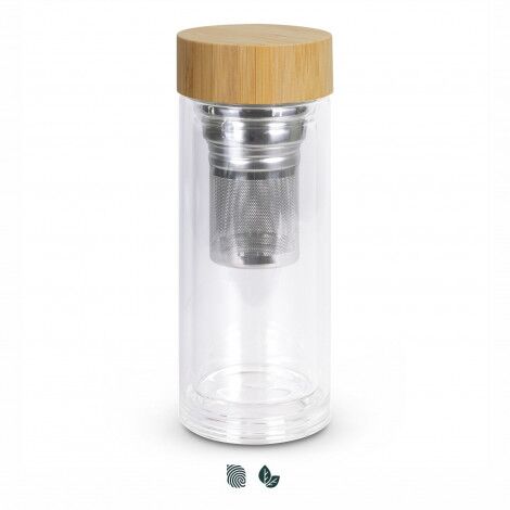 Elegant 350ml, double-wall borosilicate glass bottle which maintains hot or cold drink temperatures for longer and remains comfortable to hold. It has a removable stainless-steel infuser for tea or fruit and a secure screw on bamboo lid. The bottle is BPA-free and is manufactured from borosilicate glass which is incredibly light and very strong. Bamboo is a natural material which produces unavoidable variances in the grain pattern, colour, and branding. This product is not dishwasher safe, and handwashing is recommended.