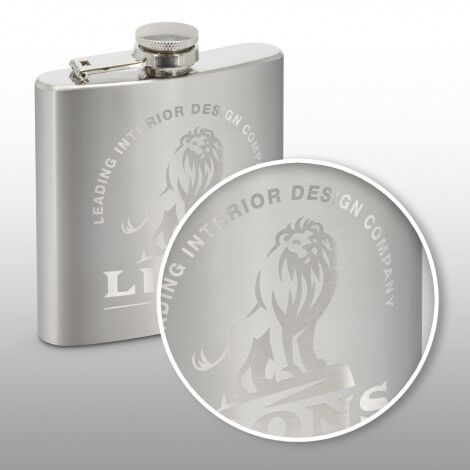 200ml stainless steel hip flask with a hinged screw top lid. It laser engraves to a natural etch and is presented in a black gift box.