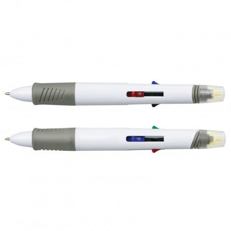 - Multi-purpose retractable four-colour ballpoint pen with highlighter