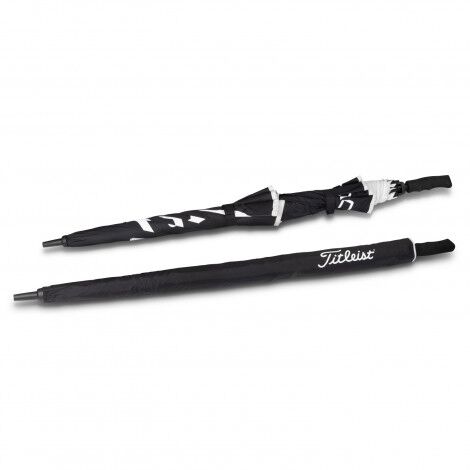 High-performance double canopy umbrella from Titleist, the golf experts. This impressive eight panel umbrella has a vented nylon canopy with two velcro ties and fibreglass ribs. Made to withstand any elements, the umbrella uses an anti-inversion design to protect against strong winds, and the canopy has a UV lining to protect from the sun. The umbrella has a strong fibreglass shaft, a nylon sleeve and a moulded EVA foam handle and the Titleist logo is showcased on the canopy, sleeve, handle and hang tag.