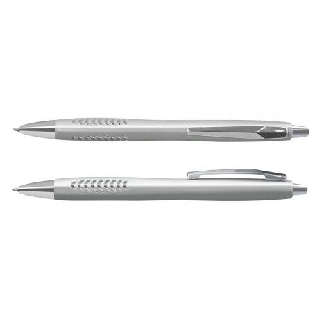 Retractable plastic ballpoint pen with a metallic barrel and shiny chrome trim. Topaz has a comfortable triangular grip with a futuristic chevron pattern that allows the shiny chrome inner barrel to show. It has a blue refill with 1800 metres of German manufactured Dokumental ink.