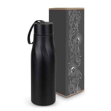 Fashion-inspired stainless steel 750ml bottle with a gloss finish. It has a screw-on lid with a black ribbon handle. Tornado is BPA-free. The bottle laser engraves to a shiny stainless-steel finish. This product is not dishwasher safe, and handwashing is recommended.