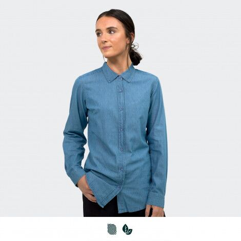 Stylish cut and sewn women’s shirt made from soft 150gsm cotton denim, perfect for retail and hospitality workplaces. The shirt features long sleeves with single button cuffs, a seven-button placket, a classic collar, and darts on the back. Available in seven sizes, the shirt should be washed with similar colours before first use.