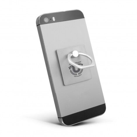 Low profile plastic phone grip which adheres securely to the back of a phone or phone case. It has a metal ring that snaps out to provide a secure finger grip or a handy phone stand.
