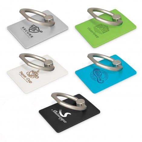 Low profile plastic phone grip which adheres securely to the back of a phone or phone case. It has a metal ring that snaps out to provide a secure finger grip or a handy phone stand.