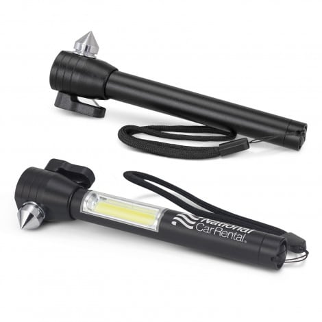 Compact multi-function metal safety tool for vehicles. It has a hammer for breaking glass, a seat belt cutter, a powerful warning light and a strong magnet for attaching it to the top of a disabled vehicle. The light uses radical COB (Chip-on-Board) technology which increases both the light intensity and the battery life. It has a handy woven wrist strap and is powered by one AAA battery which is included .