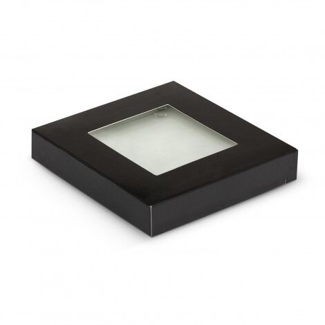 Set of two square glass coasters in an elegant black gift box with a window to show off the brand. The coasters have four soft non-skid, non-marking polyurethane pads on the base. Handwashing is recommended.