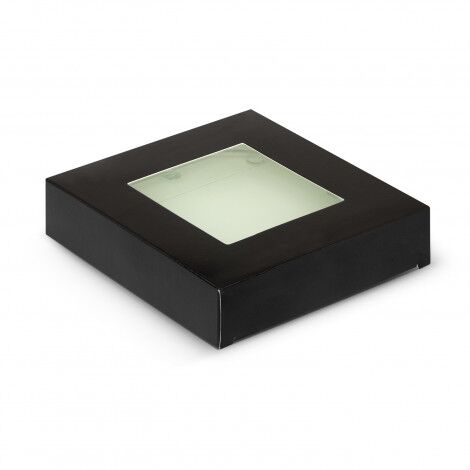 Set of four round glass coasters in an elegant black gift box with a window to show off the brand. The coasters have three soft non-skid, non-marking polyurethane pads on the base. Handwashing is recommended.