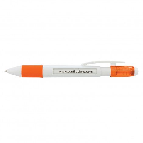 Retractable plastic ballpoint pen with a white barrel, a soft rubber grip and a rotating inner barrel which holds six different messages. Each time the push button is clicked, a new message is displayed in the two clear barrel windows. It has a blue or black refill with 1200 metres of German manufactured Dokumental ink. A production lead time of 40 working days applies to this product by air freight and orders can be sea freighted on request to reduce the freight cost.