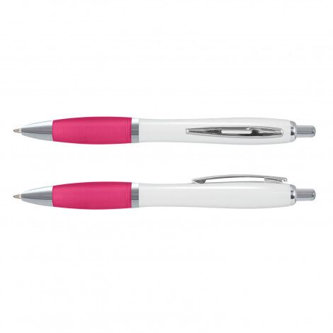 - Retractable plastic ballpoint pen with a glossy white barrel