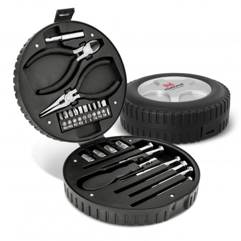 Sturdy 24-piece tool set in a novel wheel-shaped plastic case.