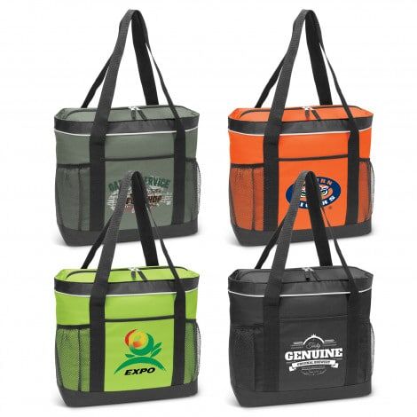 Large 26L cooler tote bag with PE foam insulation encased in a water-resistant PEVA inner liner and a secure zippered top opening. The outer construction is robust 600D polyester with decorative ripstop nylon and smart white piping around the top. It has one large slip pocket and two mesh pockets on the front. Zero has extra wide woven handles that allow it to be carried by hand or on a shoulder.